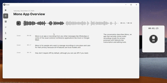تصميم Mono المبسط يجعل التقاط المحادثات سهلاً. سواء كانت اجتماع فريق صغير أو مكالمة عبر منصات متعددة، يركز التطبيق على الموثوقية مع المعالجة المحلية و مساعدين ذكاء اصطناعي اختياريين. غياب الرسوم المتكررة ووجود تحديثات مدى الحياة يجعله جذاباً للمهنيين الذين يسجلون كثيراً لكنهم لا يحبون الاشتراكات.